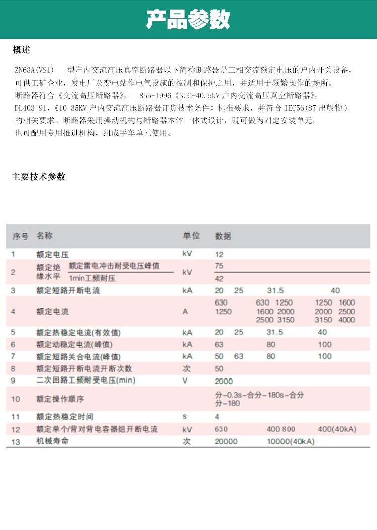 ZN63A-12(VS1)室内交流高压GB1984相符国家标准交流高压断路器“JB”,真空断路器3855“3.6〜40.5kv室内交流高压真空断路器”和IEC60056“高压交流断路器》standard.meetDL/T403“10〜35kv室内高压真空断路器定购技术条件”。