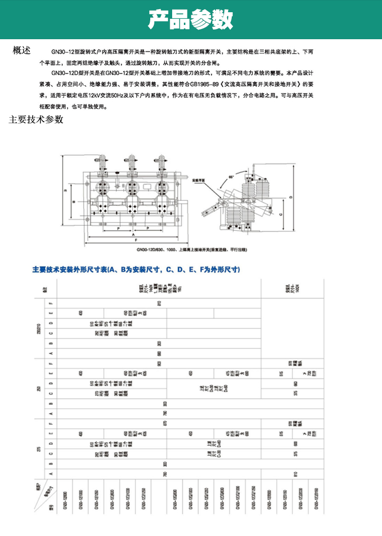 GN30-12D型开关是在GN30-12型开关的基石上添加接地刀的形式,可以满足不同电源系统的需要。该产品设计连贯,空间小,绝缘性强,容易安装和调整,并且性能满足GB1985-89≤ac。要求高压隔离开关和接地开关用以室内系统。额定电压为10kvac50hz及以下。它们用以在有电压和无负载条件下切换电路。它可以与高压开关柜一齐用到,也可以单独采用。